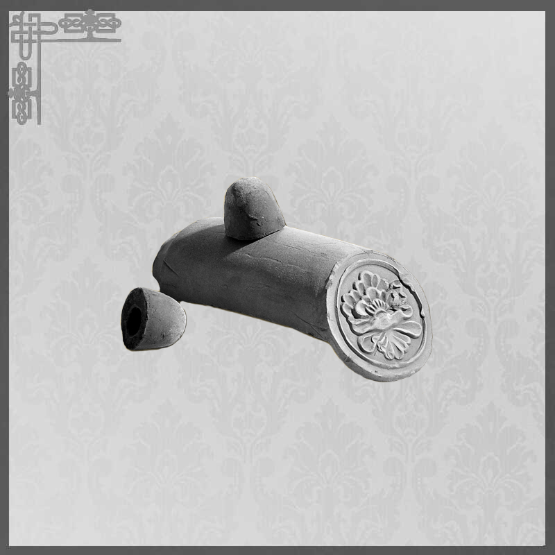 : 青瓷瓦勾頭在尺寸和設計上與琉璃瓦相同。有牡丹與龍的花紋可供選擇。勾頭上的頂帽用來保護固定勾頭與滴水的釘子不受雨水侵蝕。